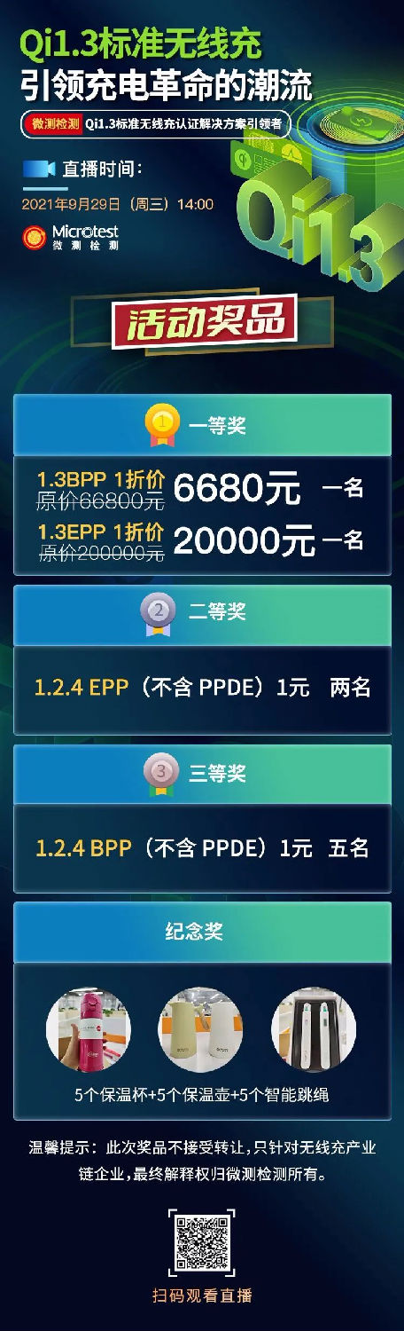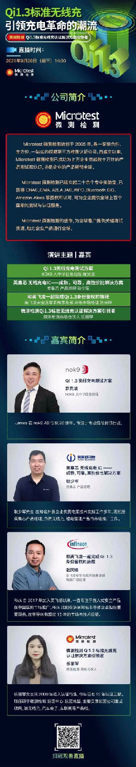 微測檢測將于2021年9月29日14:00進行《Qi1.3標準無線充引領充電革命的潮流》線上直播,直播中有多位嘉賓進行演講,為您介紹Qi 1.3標準的測試、鑒權、解決方案及認證,是無線充電從業(yè)者不可或缺的重要直播,趕快預約報名參加吧。
