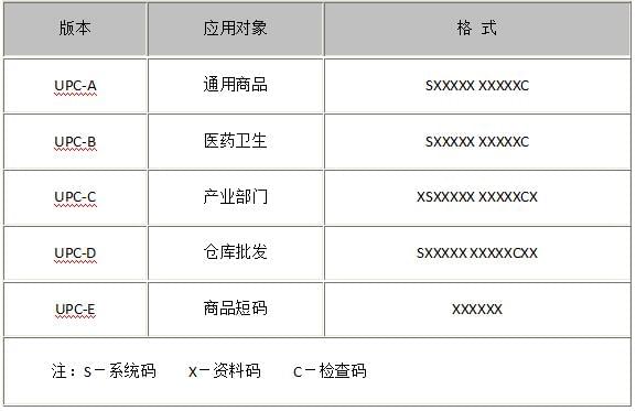 UPC碼(Universal Product Code)是最早大規(guī)模應用的條碼,其特性是一種長度固定、連續(xù)性的條碼,目前主要在美國和加拿大使用,由於其應用范圍廣泛,故又被稱萬用條碼。UPC碼僅可用來表示數(shù)字,故其字碼集為數(shù)字0~9。UPC碼共有A、B、C、D、E等五種版本,各版本的UPC碼格式與應用對象如表 2.1所示。