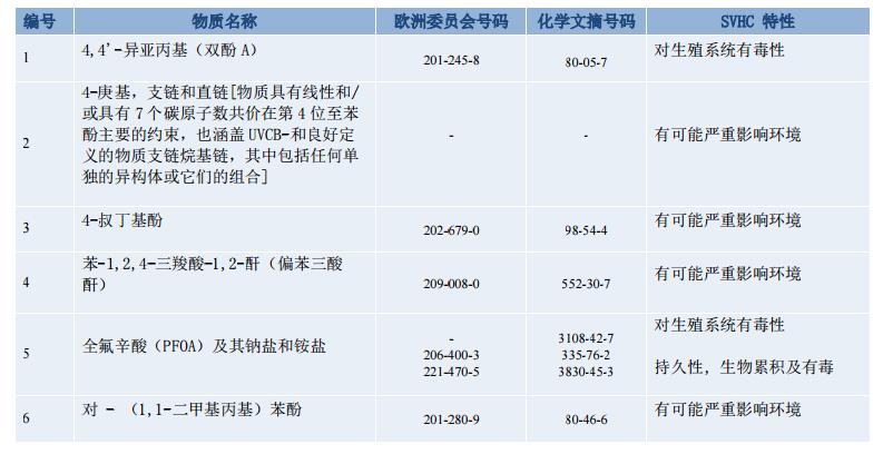 2016年9月6日,歐洲化學品管理局(ECHA)公布6個潛在的高度關 注物質的候選物質(見下表)。ECHA 目前已邀請有興趣人士進行公眾 咨詢中(45 天)(截止至2016年10月21 日)。 公眾咨詢結束后將決定是否將這些物質添加到清單中。