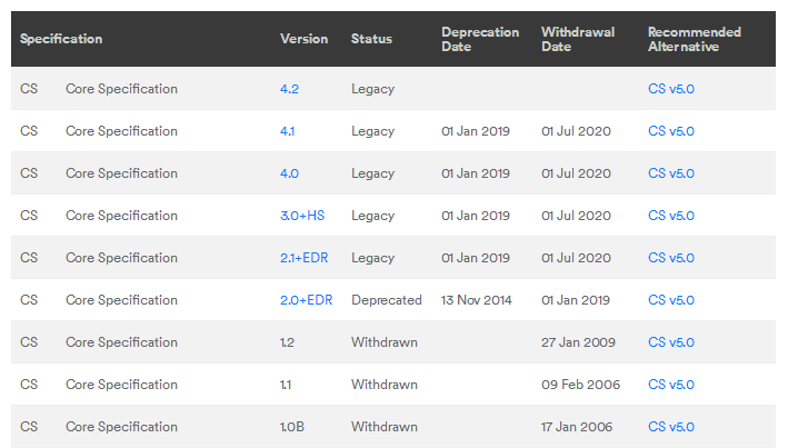 2019年1月1日起開始棄用(deprecation)藍(lán)牙核心標(biāo)準(zhǔn)版本4.1/4.0/3.0/2.1/2.1+EDR