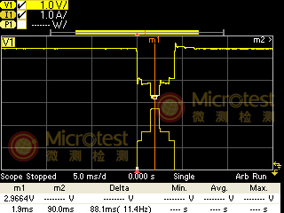 第二種情況:將電流提高至正常輸出電流的1.6倍1ms內(nèi)電壓降低,隨后電流恢復(fù)正常輸出,電壓值不恢復(fù);