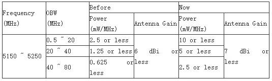 2. 5150~5250 MHz 頻段的功率限制變高(詳見下表)