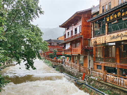 抵達(dá)千戶苗寨時(shí),天空下著淅瀝小雨,整體是陰雨、潮濕、多霧的天氣,好在空氣清新,所見之處全部綠色,流淌的溪水聲頓時(shí)讓人變得心曠神怡。
