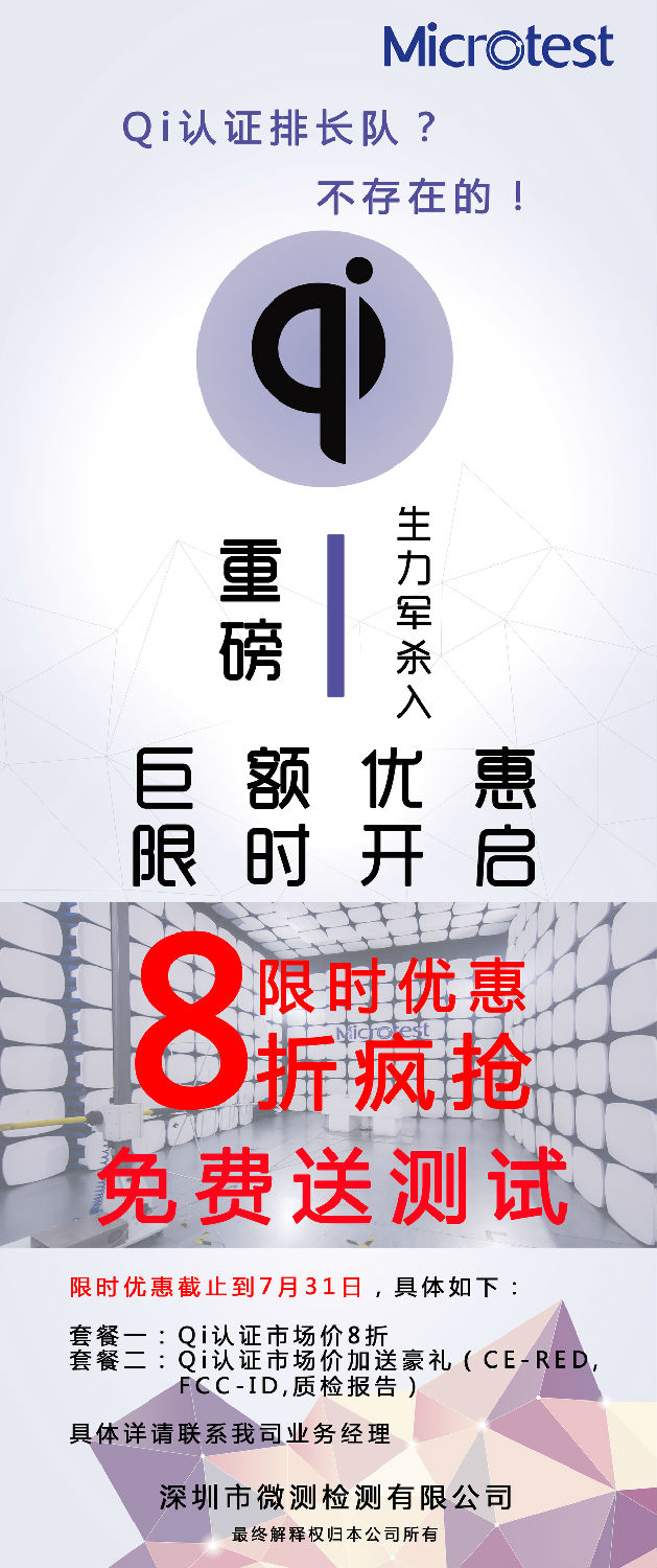 2018年無疑將是無線充Qi認(rèn)證火爆的一年,時(shí)下七月,Qi認(rèn)證儼然進(jìn)入如火如荼的階段,真的不要再錯(cuò)過搶占市場的機(jī)會(huì)了!老客戶們,新朋友們,請抓住七月的的尾巴,Microtest推出的Qi認(rèn)證優(yōu)惠進(jìn)入倒計(jì)時(shí)!