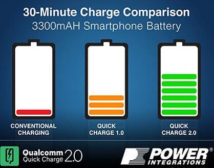 高通Quick Charge 2.0:通過調(diào)整電壓和電流的方法來提高充電功率, 主要使用高通驍龍800系列芯片。
