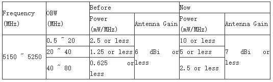 2.5150~5250MHz頻段的功率限制變高(請見下表)