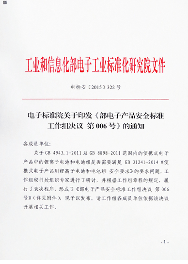 近日,工信部電子標(biāo)準(zhǔn)化研究院工作組秘書處組織專家進(jìn)行了研討,并根據(jù)工作組章程的規(guī)定,履行了表決程序,形成了《部電子產(chǎn)品安全標(biāo)準(zhǔn)工作組決議 第006號》,具體內(nèi)容如下: