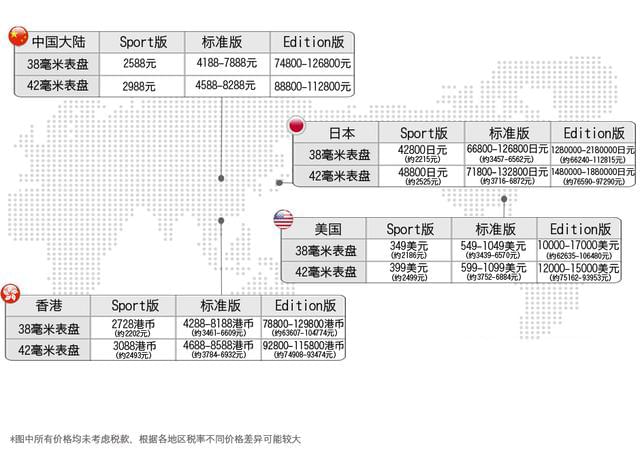 至于大家最關(guān)心的價(jià)格方面,這里為大家梳理出了大家最為關(guān)心的中國大陸、中國香港、美國以及日本這四個(gè)國家和地區(qū)的價(jià)格明細(xì)對照。綜合來看,中國香港地區(qū)的發(fā)售價(jià)格依然具有優(yōu)勢。(注:所有價(jià)格均為蘋果官網(wǎng)顯示的價(jià)格,其中美國、日本Apple Watch的價(jià)格為稅前價(jià)格。)