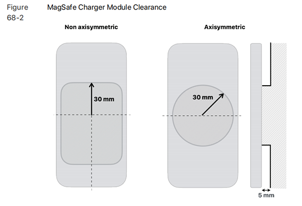 2)對于所有支持的設(shè)備方向,從MagSafe充電器模塊表面的中心到設(shè)備頂部邊緣不超過30mm;對于任何超過30mm的的配件,與設(shè)備背面(配合面)保持5毫米的間隙;