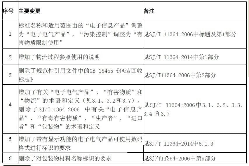 中國(guó)RoHS重要的支撐標(biāo)準(zhǔn)之一SJ/T 11364-2014版《電子電氣產(chǎn)品有害物質(zhì)限制使用標(biāo)識(shí)要求》即將于2015年1月1日起正式實(shí)施。和2006版相比主要變化如下: