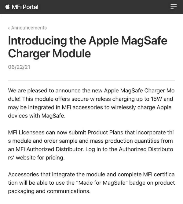 蘋果已于6月22號(hào)發(fā)布公告,開放MagSafe磁吸無線充模塊授權(quán)給第三方MFi會(huì)員企業(yè),會(huì)員企業(yè)可以向蘋果提交MagSafe充電模組的產(chǎn)品計(jì)劃并完成 Made for MagSafe認(rèn)證。