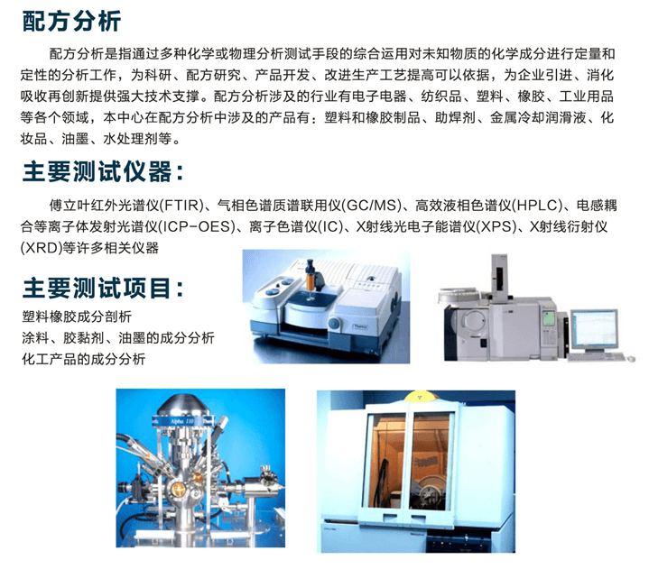 配方分析是指通過多種化學(xué)或物理分析測試手段的綜合運用對未知物質(zhì)的化學(xué)成分進行定量和定性的分析工作,為科研、配方研究、產(chǎn)品開發(fā)、改進生產(chǎn)工藝提供可靠依據(jù),為企業(yè)引進、消化吸收再創(chuàng)新提供強大技術(shù)支撐。配方分析涉及的行業(yè)有電子電器、紡織品、塑料、橡膠、工業(yè)用品等各個領(lǐng)域,配方分析中涉及的產(chǎn)品有:塑料和橡膠制品、助焊劑、金屬冷卻潤滑液、化妝品、油墨、水處理劑等。